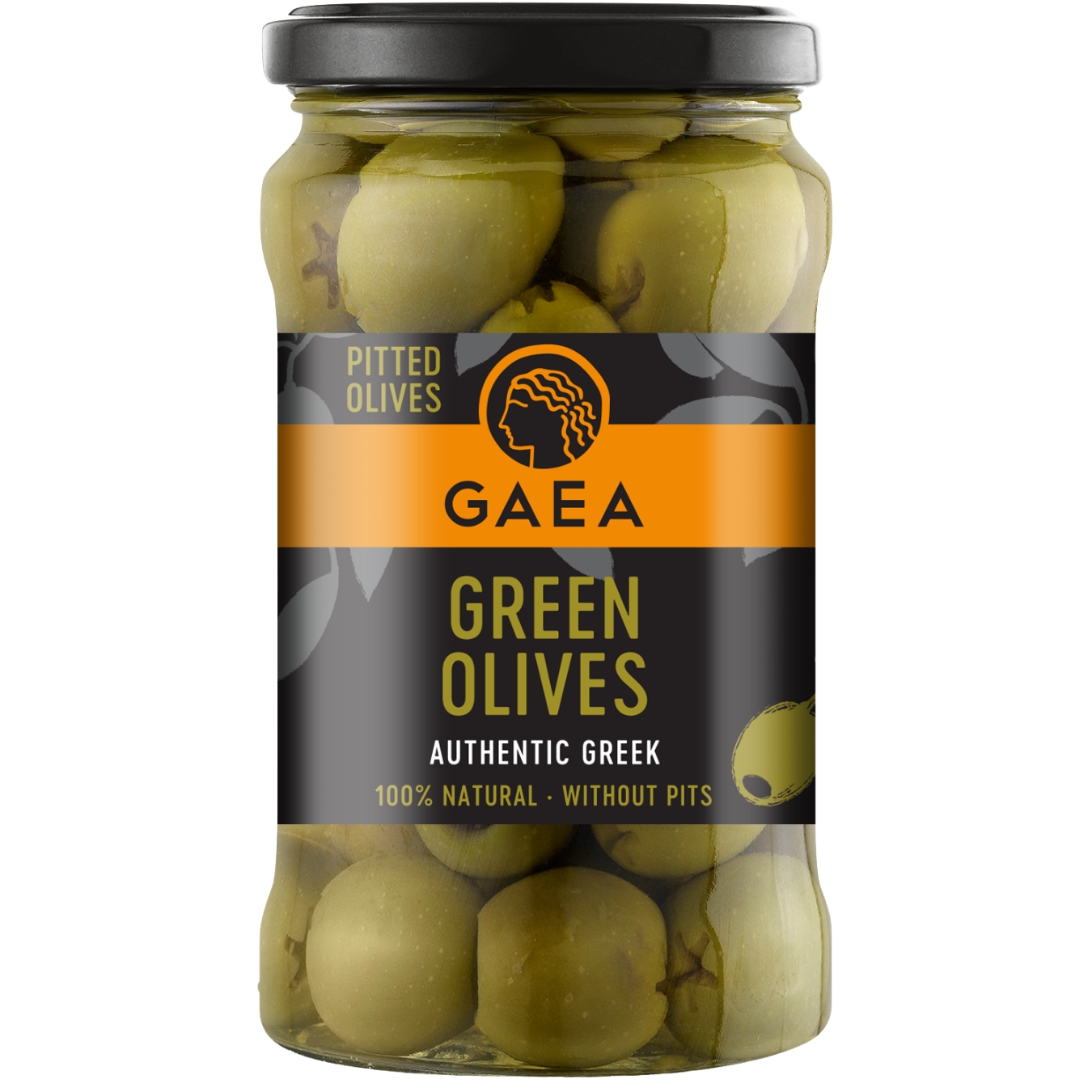 GAEA Green Chalkidiki Greek Olives are pitted and directly placed in brine to preserve the thickmeaty flesh, preservative free and with reduced salt. The brine is a Gaea 100% natural secret recipe that keeps the flavour of these tasty Greek giants intact!